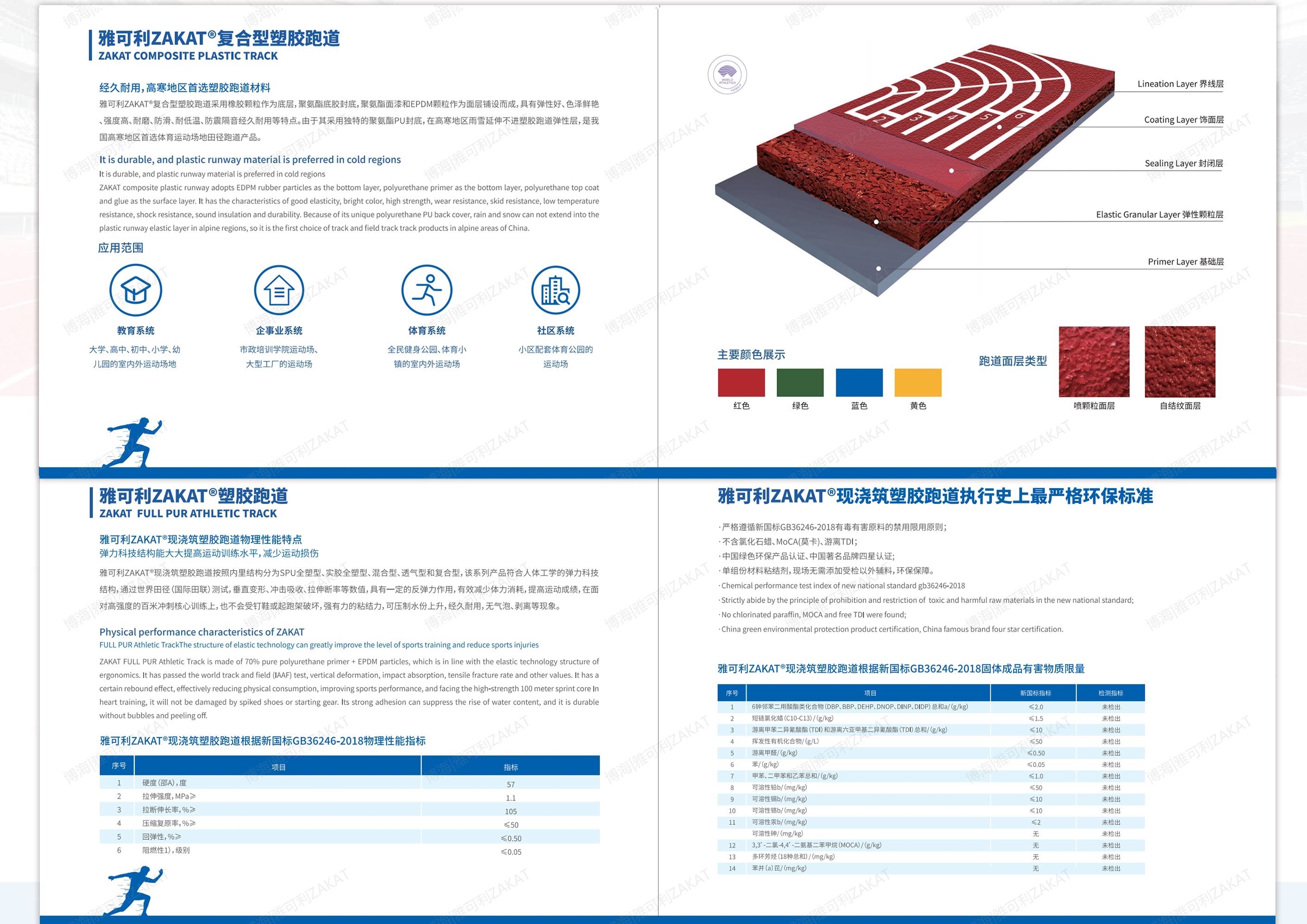 由纯聚氨酯底胶铺设而成,为世界田径(国际田联)认可推荐为各大型国际赛事运动员竞赛和训练专用场地类型,耐高低温、冲击吸收哈哦、拉伸强度高、垂直变形弹力好等优渥物理性能特点,雨后即可使用,可全天候训练竞赛使用,是各种大型田径体育场优选塑胶跑道材料。